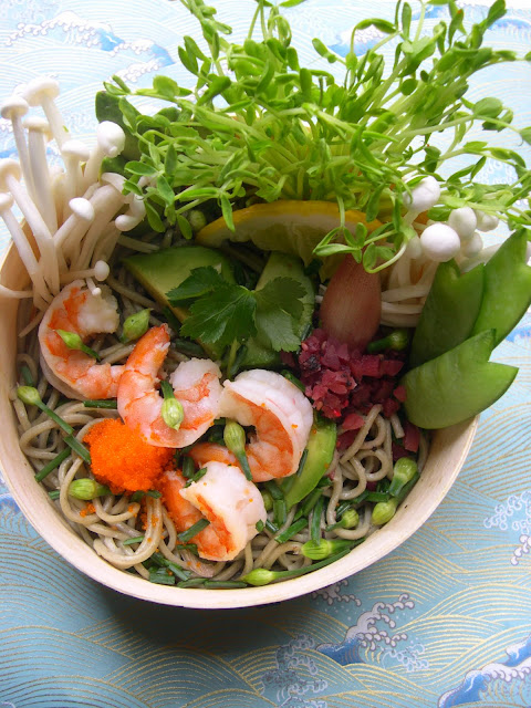 I combined the cooked soba noodles with a light ginger dressing, garlic buds, shrimp, avocado slices, pickled plums, yuzu, snow pea shoots, tobiko, myoga, mitsuba and enoki mushrooms: