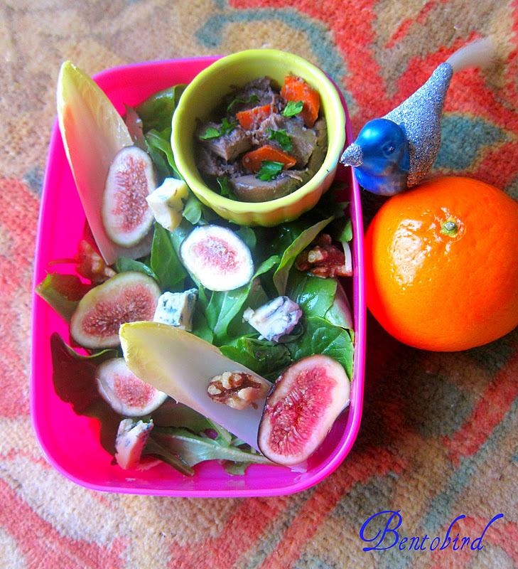 Here it is bento'd in a little green container on a bed of endive, fresh herbs and lettuces, with fresh figs, some of that lovely French blue cheese, dressed in walnut oil...